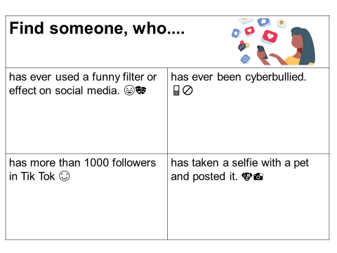1. Greeting. 2. Warm up. “Find somebody, who…” game. a) Students must walk around the room and ask classmates to complete the cards. b) Students share the information they have found. Teacher: -Just like we made connections in class, social networks help people connect online! But just like in real life, we need to be careful about who we connect with. -How do you think what is the theme of our lesson today? 3. Word cloud activity: Teacher: -What words do you think about when you hear the term "Social networking."? https://www.mentimeter.com/app/presentation/al59zxatj4sy6yd312p1w9wi7b2iubxu/edit?question=6969m7n7ctx7 a) Students give their answers. |