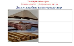 №1-тапсырма: жұптық жұмыс «Тобыңмен таңда» әдісі АКТ ноутбуктен көрсетілген мәлімет бойынша тапсырма орындау. Бағалау критерийі: -Ағаш пен темірді ажаратып -қажетті материалдарды таңдайды |