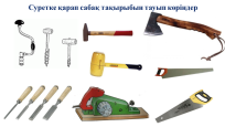 Сабақ барысы. Слайд көрсетіледі. Ағаш және темір өңдеу верстактарының құрылысы мен жұмыс істеу принциптерін және қол құрал-саймандарын көрсетіледі (ара, қылара, зімпара т.б.). сонымен қатар техника қауіпсіздік ережелерімен таныстырылады.