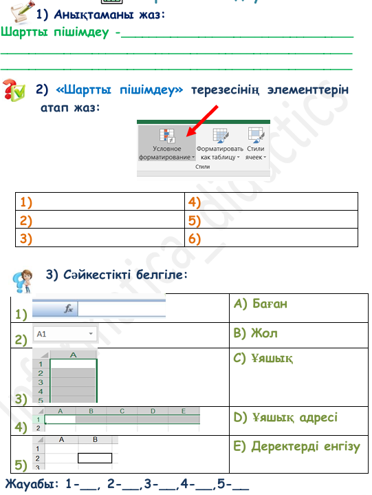 Жұмыс парағы бойынша тапсырмаларды орындайды: - «Шартты пішімдеу» анықтамасын жазады;