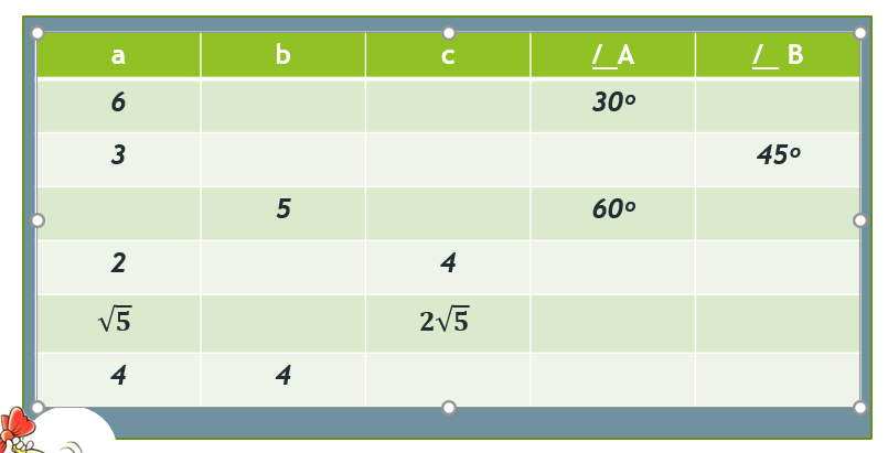 8.1.3.7 применять значения синуса, косинуса, тангенса и котангенса углов 300, 450, 600 для нахождения элементов прямоугольного треугольника; 8.1.3.8 находить стороны и углы прямоугольного треугольника по двум заданным элементам. |