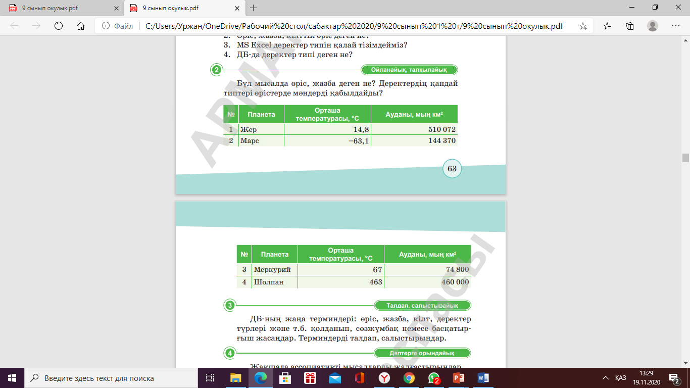 I. Ұйымдастыру кезеңі -Оқушылармен сәлемдесу,сыныпты түгендеу. -Ынтымақтастық атмосферасын құру. Оқушыларды сабаққа ынталандыру мақсатында психологиялық ахуал туғызу үшін «Жылы лебіз» әдісін қолданамыз.Оқушылар бір-біріне тілек айтады, бір-бірінің көңіл күйін көтереді. -Қауіпсіздік ережелерін ескерту ІІ.Алдыңғы білімдерін тексеру Өткен тақырып бойынша өтілген анықтама сөздерді сұрау. Сұрақ-жауап әдісі. Оқу тапсырмалары: