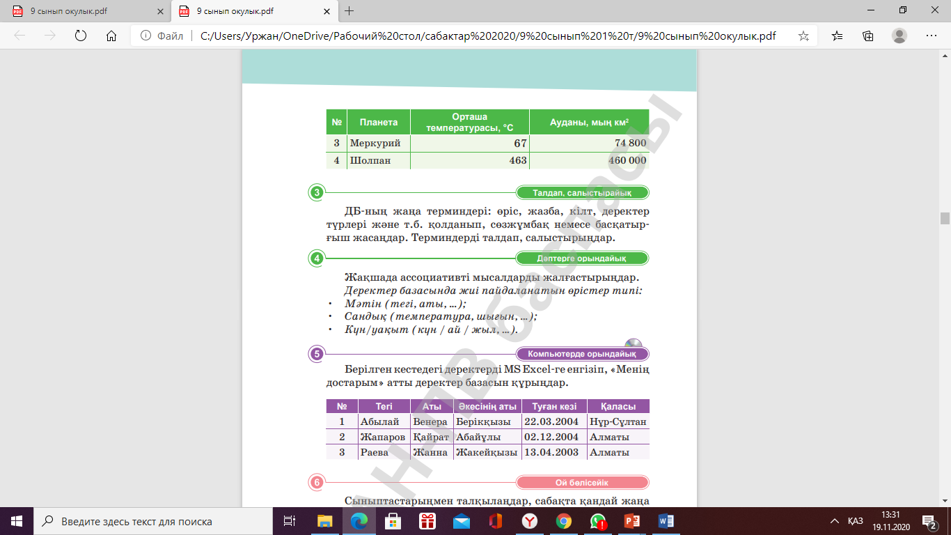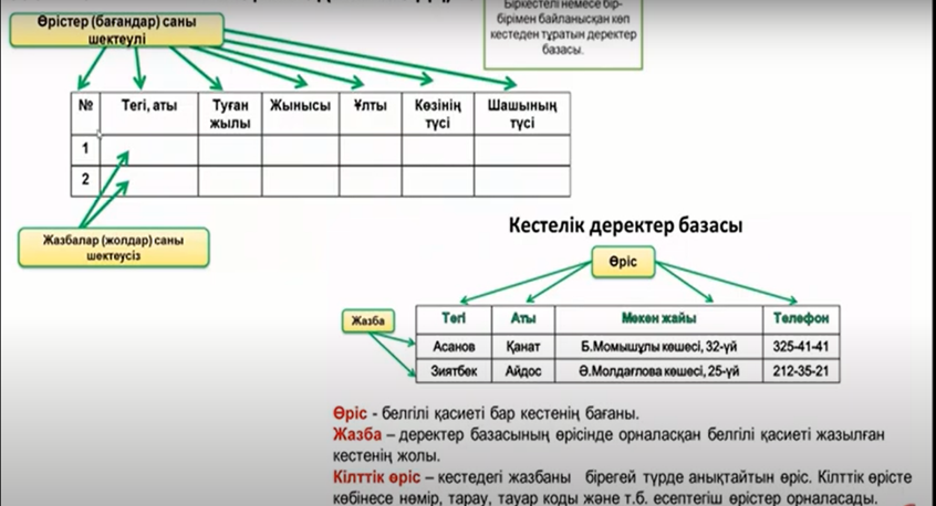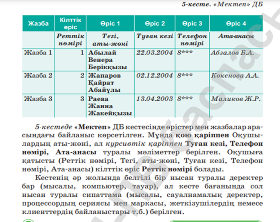 Мұғалім слайд арқылы сабақты түсіндіреді. Мақсаты: жаңа тақырып бойынша теориялық білімдеріне еске түсіру. Ойлан ЕхсеІ кестелік процессорында деректер базасын жасап, өңдеу бойынша алған білімді өмірде қалай қолдануға болады? Деректер базасымен жұмыс жасауда алған білімдеріңді күнделікті өмірде (үйде, мектепте, және т.б) қалай қолдануға болады деп ойлайсың? Нақты ұсыныстар, дәлеледі мысалдар келтір. Реляциялық ДБ (кестелік)