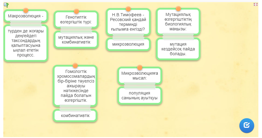 Дескриптор Білім алушылар: - эволюцияның факторлары мен бағыттарын анықтайды; - эволюцияның факторлары мен бағыттарын эволюциядағы мәнін анықтайды.