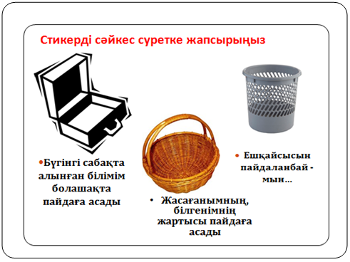 Жеке жұмыс: Сабақтың соңында оқушылар рефлексия жасайды: - нені үйренді; - не нәрсе түсініксіз болып қалды; - немен қайта жұмыс жасау керек.