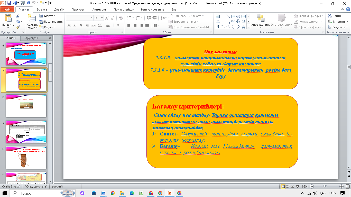 7.3.1.5 қазақ халықының отаршылдыққа қарсы ұлт-азаттық күресінің себеп-салдарын анықтау; 7.3.1.6 ұлт-азаттық көтеріліс басшыларының рөліне баға беру; |