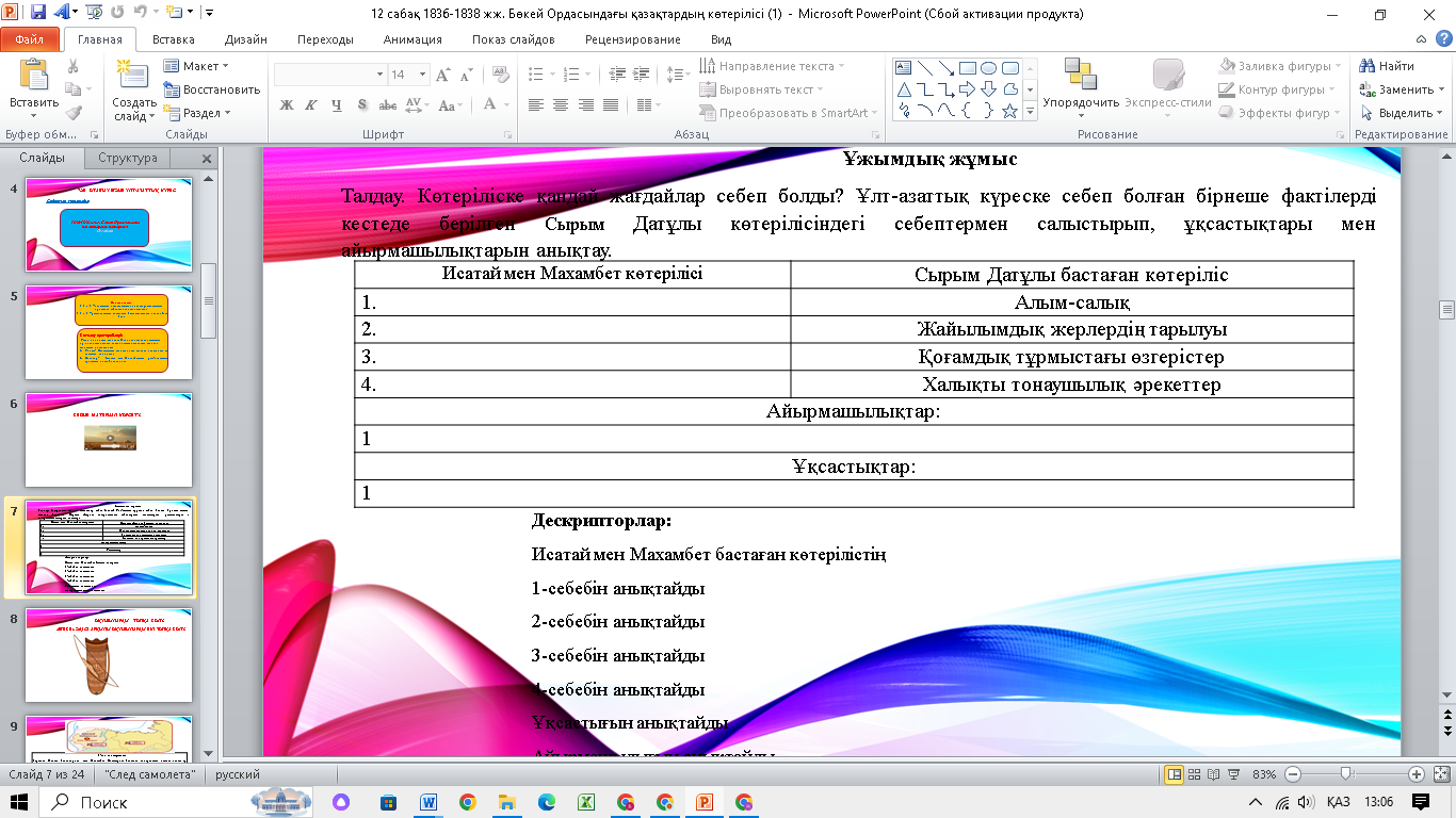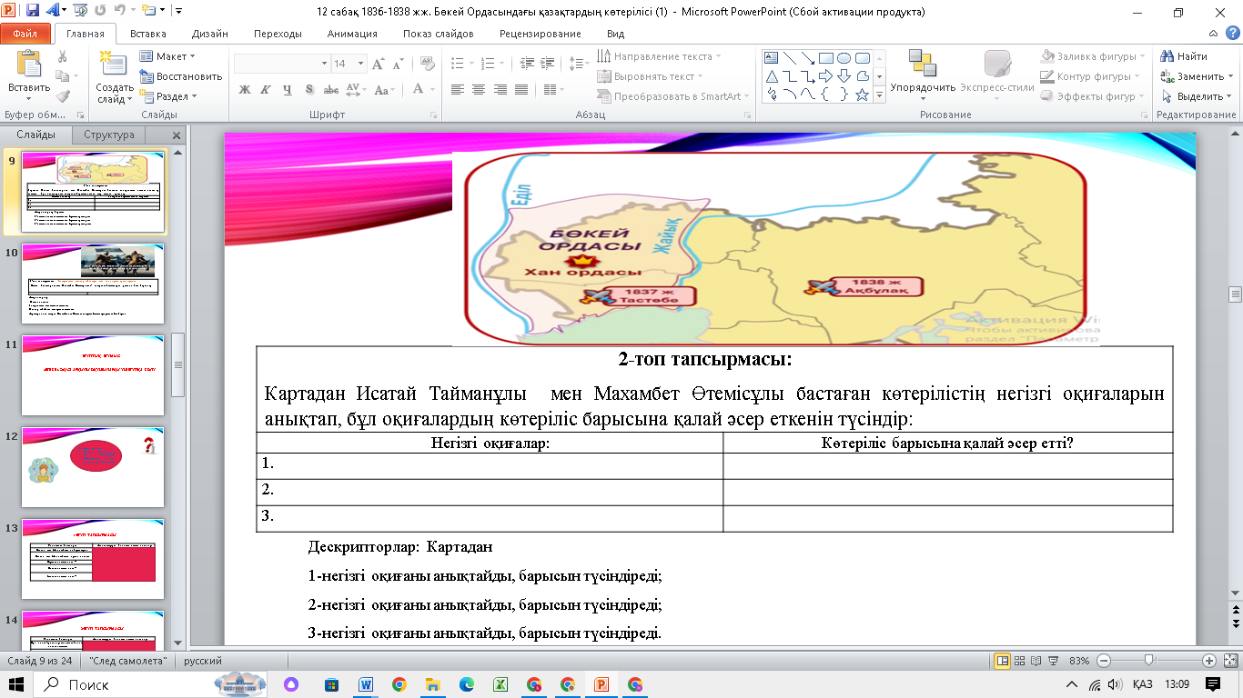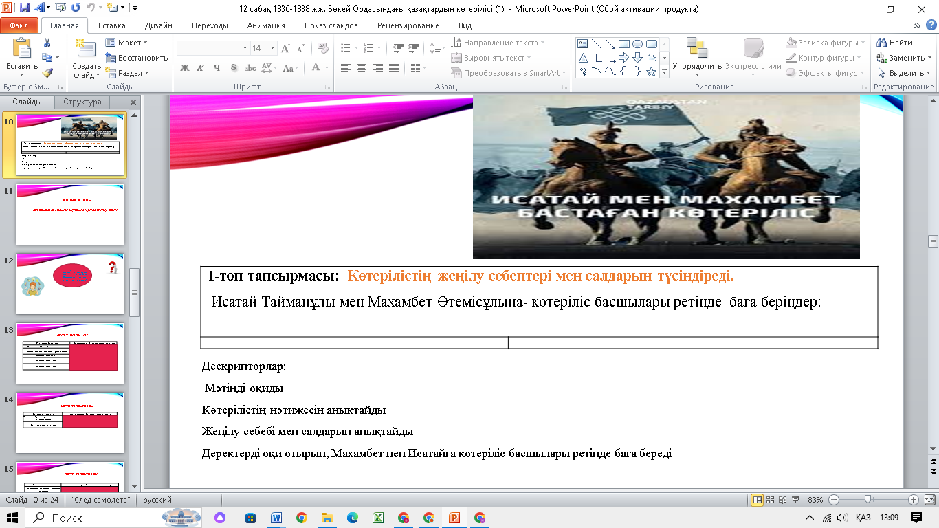 Сабақтың тақырыбы мен оқу мақсатымен, бағалау критерийларымен танысады. Көрсетілген бейнематериал арқылы оқушылар өз ойларын ортаға салады. Тапсырманы орындау барысында қолданады. Дескрипторлар: Исатай мен Махамбет бастаған көтерілістің 1-себебін анықтайды 2-себебін анықтайды 3-себебін анықтайды 4-себебін анықтайды Ұқсастығын анықтайды Айырмашылығын анықтайды Интербелсенді тақта арқылы оқушылар топқа бөлінеді. Дескрипторлар: Мәтінді оқиды Көтерілістің нәтижесін анықтайды Жеңілу себебі мен салдарын анықтайды Деректерді оқи отырып, Махамбет пен Исатайға көтеріліс басшылары ретінде баға береді Дескрипторлар: Картадан 1-негізгі оқиғаны анықтайды, барысын түсіндіреді; 2-негізгі оқиғаны анықтайды, барысын түсіндіреді; 3-негізгі оқиғаны анықтайды, барысын түсіндіреді. Исатай мен Махамбеттің ортақ идеяларын айтады. Оқиғаның маңыздылығы мен салдарын айтады. Көтерілістің жағымды және жағымсыз жақтарын айтады. ҚБ арналған 10 балдық тапсырмаларды орындайды. Әр сұрақтың дұрыс жауабын таңдайды. |
