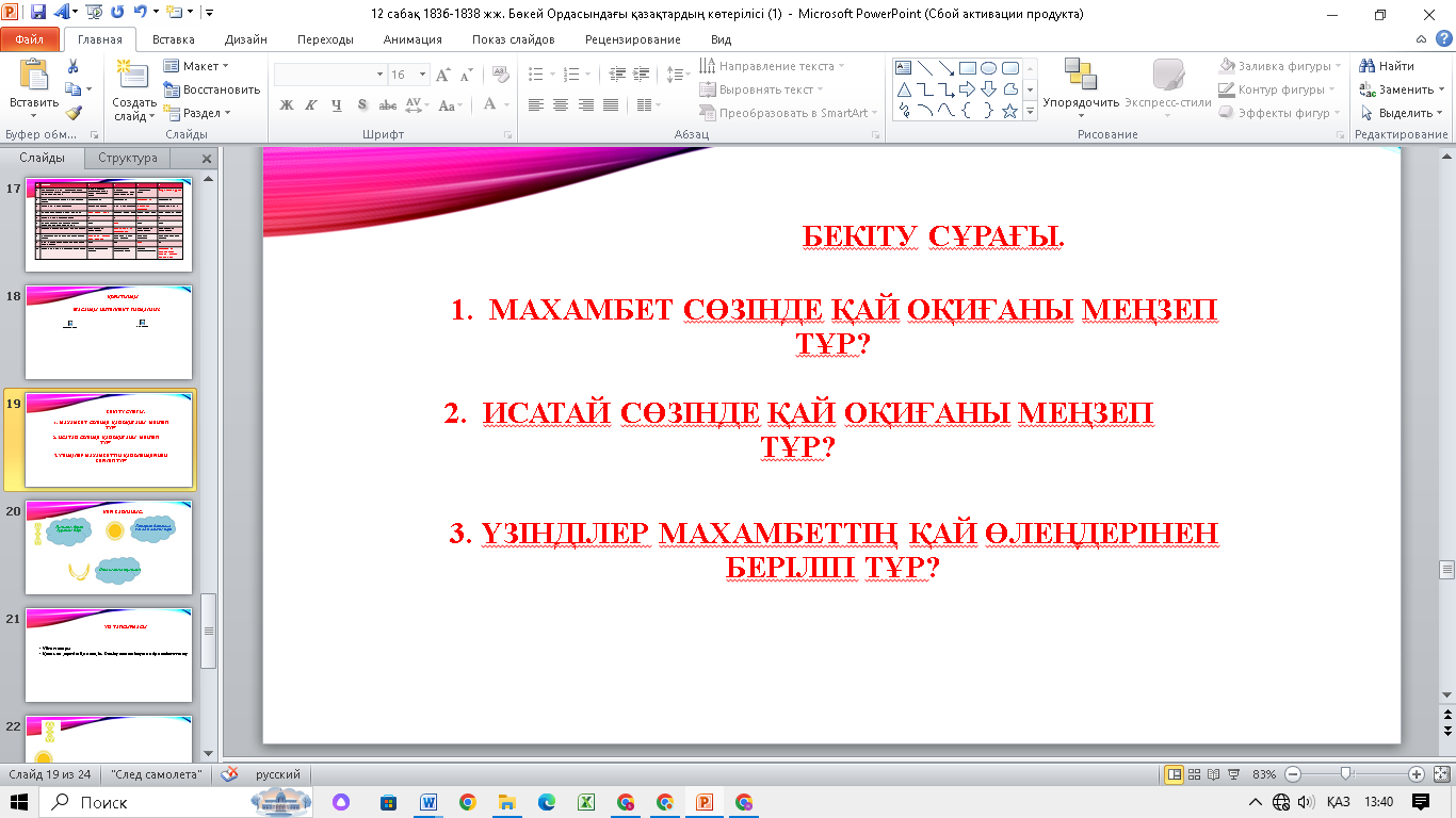 Ұйымдастыру бөлімі. Оқушылармен амандасу, сыныппен жағымды психологиялық ахуал қалыптастыру, сыныпты түгендеу, сабаққа зейінің аударту; ІІ. Үй тапсырмасын бекіту. Wordwall платформасында 10 тест тапсырмасын орындау арқылы үй тапсырмасы тексеріледі. ІІІ.Оқушылардың қызығушылығын ояту. Қазақ тілі, әдебиеті пәнінің мұғалімі С.Абиева Махамбеттің «Мен, мен, мен едім...» өлеңін оқиды. -Балалар бұл кімнің өлеңі? - Махамбет қай батырдың адал досы болды? - Исатай мен Махамбеттің көтеріліс кезінде кім хан болды? Махамбет, Исатай , Жәңгір хан суреттері көрсетіледі.