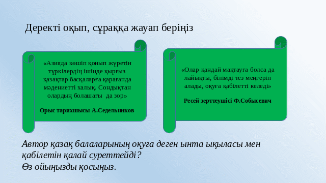 Ттерминдермен жұмыс жасайды Оқушылар суреттегі нысандарды бір-бірімен байланыстырып,тарихи әңгіме құрастырады; Оқушылар тұлғалармен танысады Мәтінді оқып өз ойларын жазады Оқушылар даталарды біледі Оқушылар жауап құрылымын сауатты құрайды; -Дәйекпен дәлелденген жауапты береді; |