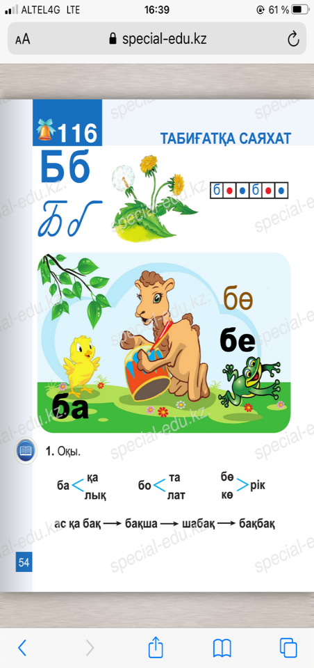 Дескриптор: 1.Мәтінді тыңдайды 2.Сұрақ- жауап арқылы талқылайды. 3.Мәтінде кім,не туралы айтылғанын анықтайды ТЖ-«Адасқан буындар» ойыны Бо-та, бал-ға,ба-қа, бө-рік, бақ-бақ,Бал-та,Бө-пе Дескриптор: 1.Сөздерді буындап , тұтас оқиды. 2Дыбыстық талдау жасайды |