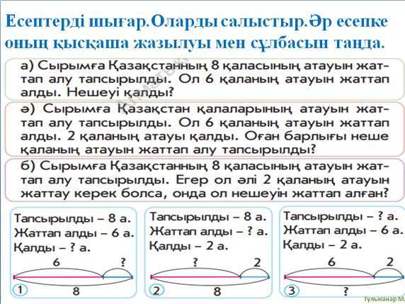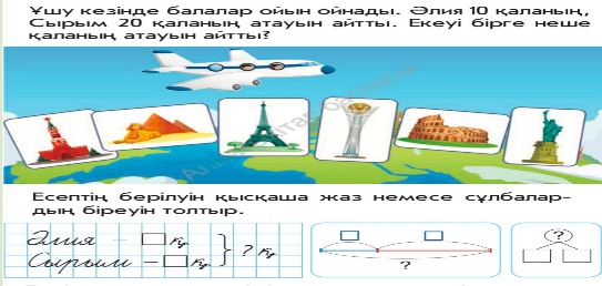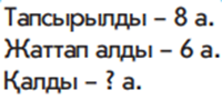 1-тапсырма.Топтық тапсырма Есеп: Сырымға Қазақстанның 8 қаласының атауын жаттап алу тапсырылды.Ол 6 қаланың атауын жаттап алды.Нешеуі қалды?
