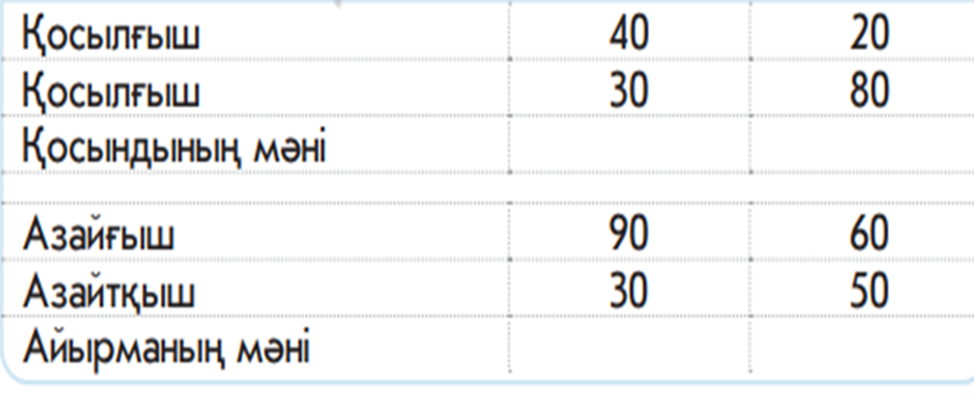 Есептің қысқаша жазбасын табады ,сәйкес сұлбасын таңдайды,есепті шығарады. Қосу мен азайтудың белгісіз компоненттерін табуға берілген есептерді шығарады, кері есептер құрастырады және шығарады. |