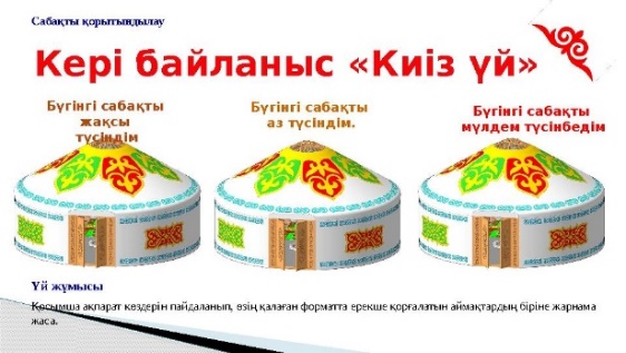 негізгі ойды анықтайды. Жаттығу жасайды Топтық жұмыс постер қорғайды 1.Суретке қарап мәтінге сәйкес бөлігін әңгімелейді 2.Суретке қарап сөйлем құрайды 3.Суретке қарап бата айтады Микрофон алған оқушылар сұрақтарға жауап береді Мәтіндегі оқиға қандай нақыл сөзге құрылғанын тауып айтады. Үй тапсырмасын алады Тапсырманы орындайды Кері байланыс жасайды Сабақты түсінген, түсінбегеніне қарай кері байланыс береді. |