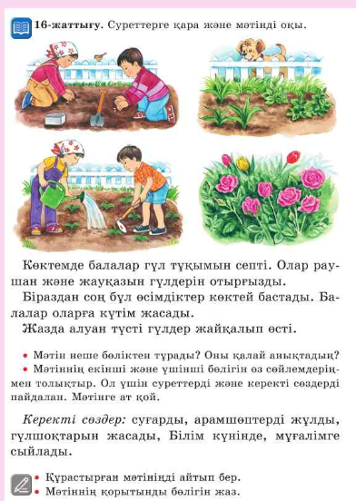 Дескриптор: Берілген бөліктерден керекті сөздерді пайданып, әңгімені жалғастыра алады-1 Мәтінге ат қоя біледі-1ұпай.