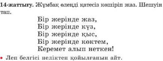 Дескриптор: 1.Жұмбақты оқып, шешуін табады-1 2.Қатесіз көшіріп жазып, леп белгісі неліктен қойылғанын айтады-1
