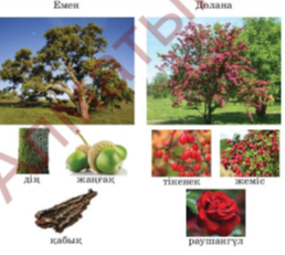 Оқушылар сұрақтарға жауап береді Оқушылар ағаш тұралы мақал-мәтел,жұмбақ айту арқылы сабақтың тақырыбын ашады Емен ағашының пазлын құрап шығады Жазылым,айтылым. Жаңғақ-орех Бұтақ-ветка Дің-ствол Қабық-кора Сая-тень