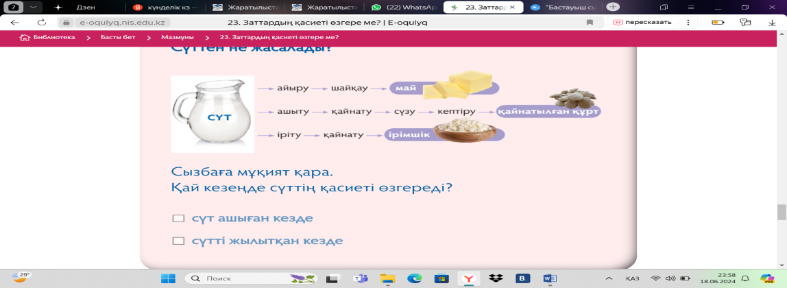 “Ізденуші” тобы “Сүттен не жасалады?” Сүттен әзірленетінін тағамдарды атау. Қай кезеңде сүттің қасиеті өзгереді? (сүт ашыған кезде) Қай кезеңде жаңа зат пайда болды?( ұйыту нәтижесінде (айран), сүтті айыру кезінде (май),(құрт, май мен ірімшік бастапқы сүт қалпына айнала алмайды)