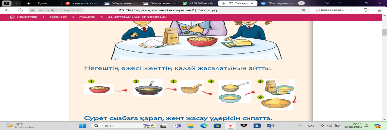 Тосап дайындау үдерісінде қандай заттар пайдаланылды? Үдеріс барысында заттар өзгерді ме? Қандай заттар өзгерді? Тосап жасау үдерісін қалай атауға болады? Ол немен байланысты? Нәтижесінде қандай зат алынды? Үдеріс басындағы зат пен соңында алынған затты салыстыр.Олар туралы не айтуға болады? Топтық жұмыс «Бірге ойланайық» әдісі “Тәжірибе жасаушы” тобы Жентті қалай жасайды? Мүмкіндігше жент (қоспа) көрсету. -Жент (қоспа) дегеннің не екенін білесіңдер ме? Оны жеп көрдіңдер ме? -Женттің құрамындағы заттарды ата. -Қалай жасалатынын еске түсіріп көр. -Тары қалай жентке айналды? -Тары мен женттің қасиеттерінің бір-бірінен айырмашылығы бар ма? -Оқулықтағы инфографиканы зерделей отырып (немесе тәжірибені пайдаланып), жент жасау үдерісін айтып бер. (Тарыны қуыру, тарыны түю,ұнтақталған тарыны елеуіштен өткізу,ұнтақ тарыға сарымай, қант араластыру)