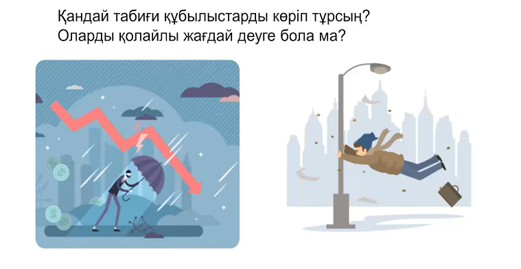 Дескриптор: -қолайсыз климаттық жаңдайларға сай ұғымдарды таңдайды; -қауіпті табиғат құбылысын анықтайды; -тұжырымдардың ақиқат не жалған екенін табады ФБ-4 балл