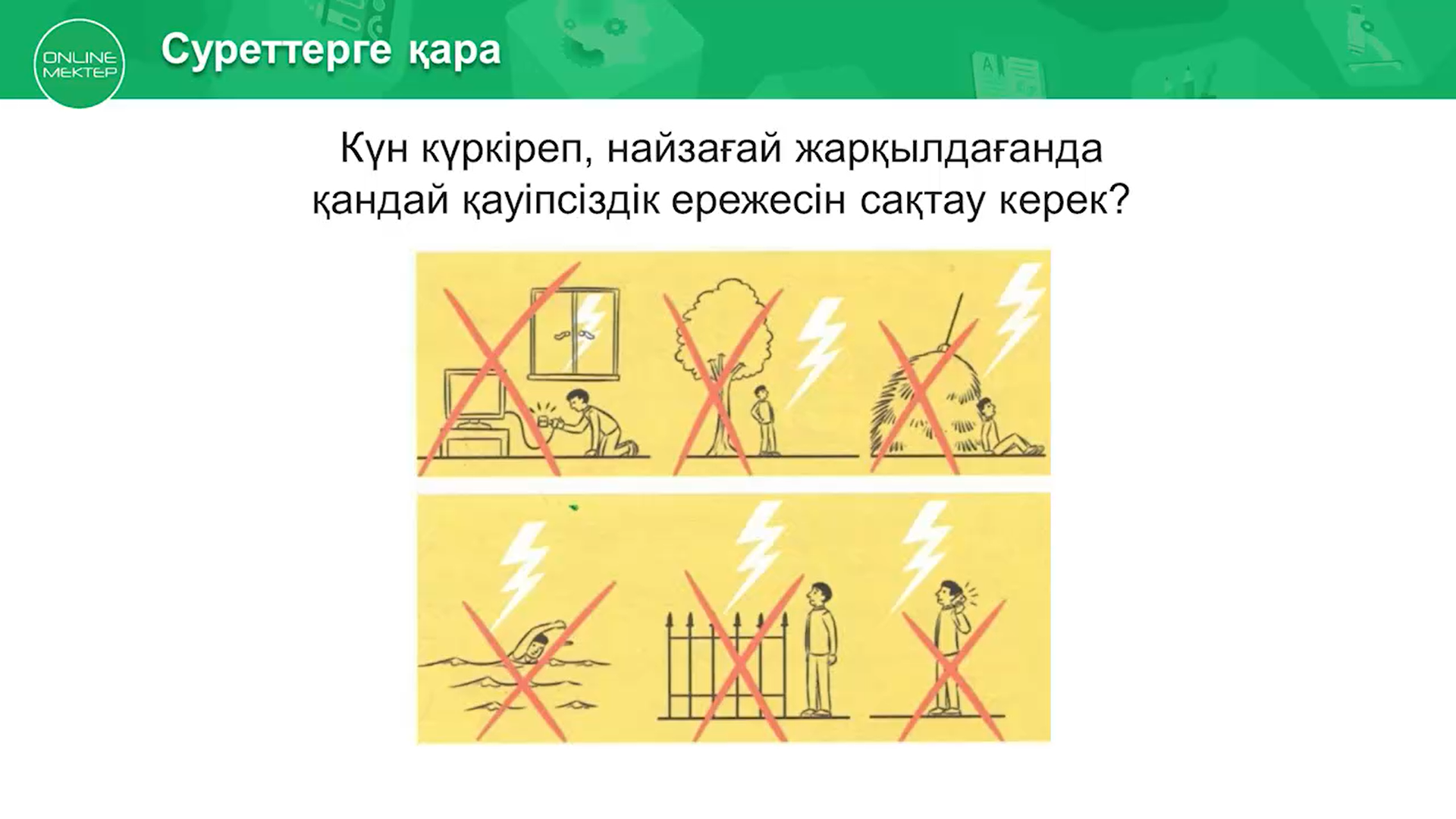 ҚБ: Мұғалімнің ауызша бағалауы үздіксіз жүріп отырады. Дескриптор: -қауіпті табиғат құбылыстары кезіндегі қауіпсіздік ережесін құрастырады; -ойларын жүйелі жеткізеді. ФБ-4 балл Топтық бағалау