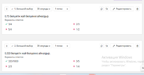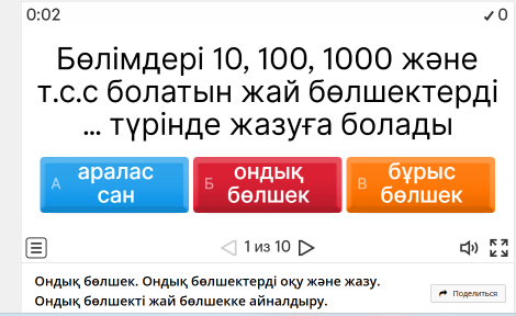 Дескриптор: 2 балл 1.Квесттегі сұрақтарға жауап береді. 1балл 2.Кеңестерді пайдаланып ойынның соңына жетеді. 1 балл Дескриптор: 2б 1.Ондық бөлшектерді табады. 1балл 2.Жай бөлшек түрінде жазады. 1балл Бірін-бірі бағалау Дескриптор:2 балл 1.Жай бөлшектерді қысқартады. 1балл 2.Жай бөлшектерді ондық бөлшектер түрінде жазады. 1балл «9-10»-3б «7-8»-2б «4-6»-1б «1-3» 0б Платформа арқылы бағалайды. 10 балл |