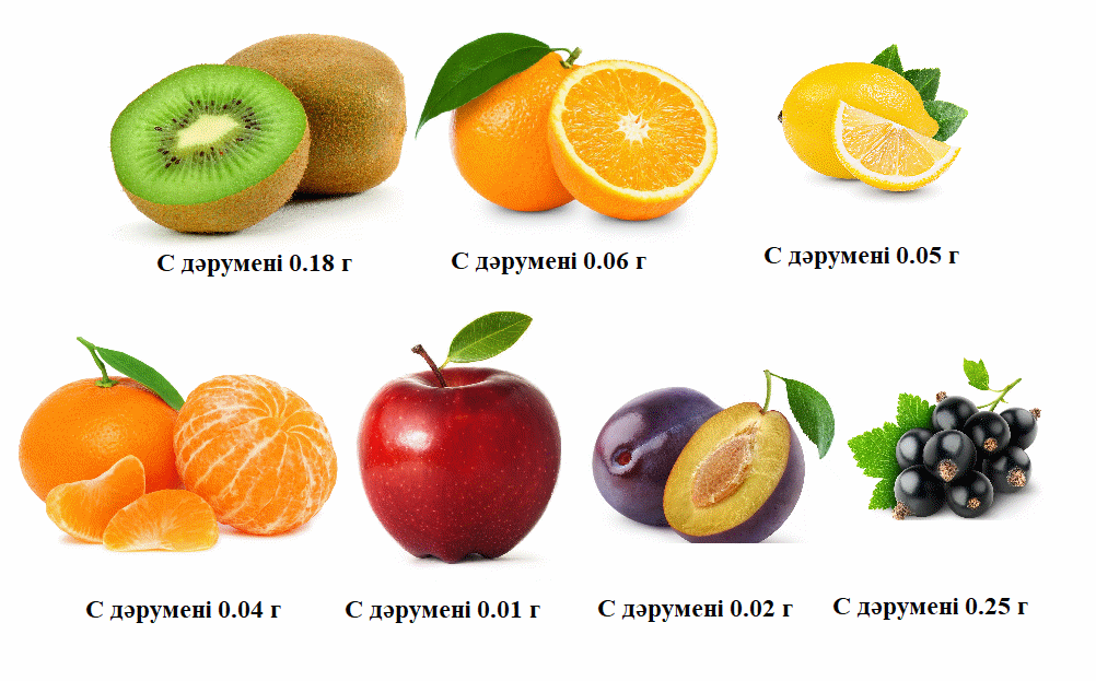 Тапсырма №1 . Дәрігерлер С дәруменін деніміз сау болу үшін күнделікті рационға ең аз дегенде 0,08 г, ал ең көп дегенде 0,12 г тұтыну ұсынады. Әсіресе С дәруменін біз жемістерден алады екенбіз.