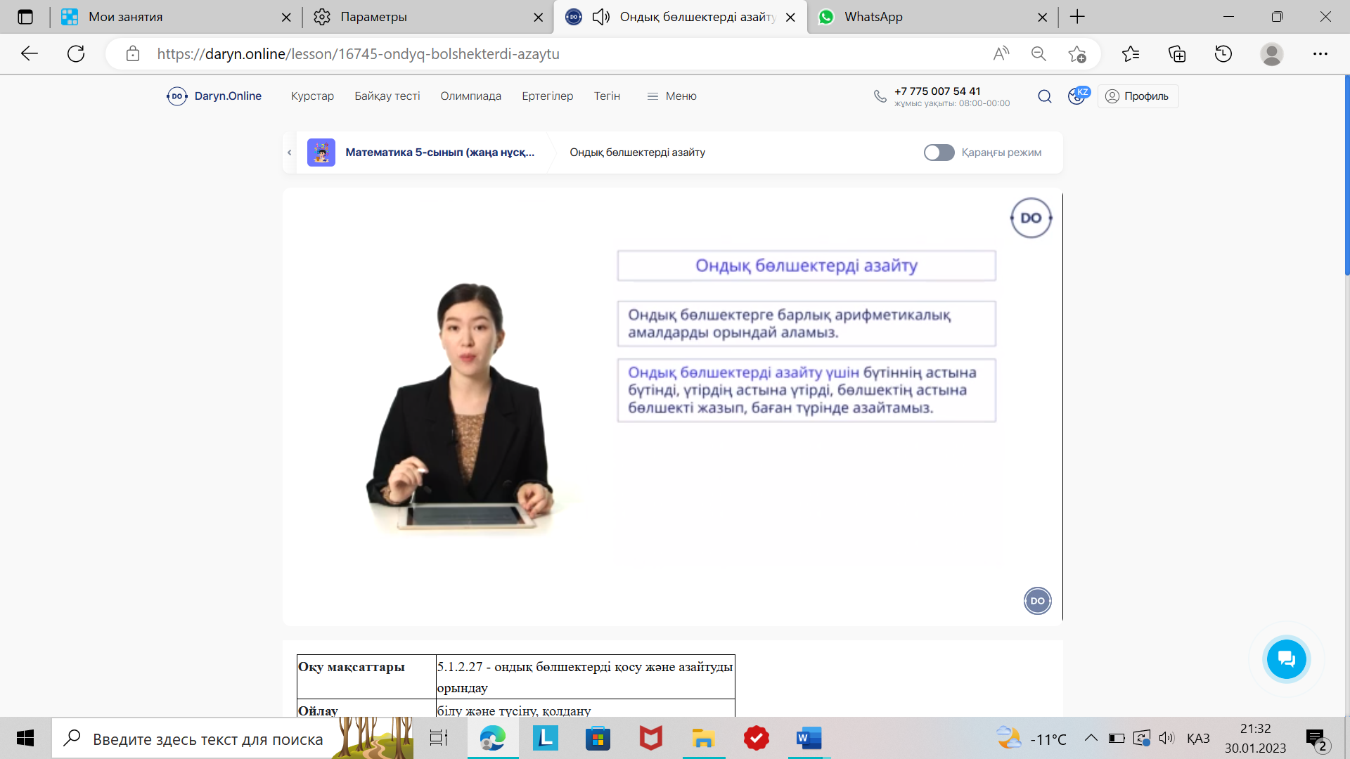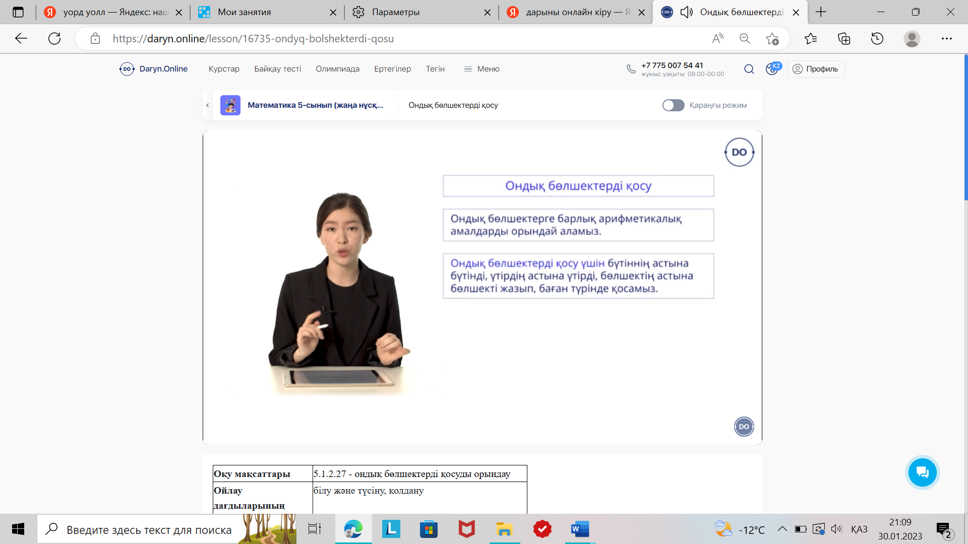 Сабақтың тақырыбы анаграмма түрінде беріледі. Мұғалім оқушыларға сабақтың тақырыбы, мақсатымен таныстырады. Жаңа сабақ Дарын онлайн сайтындағы бейнежазба арқылы түсіндіріледі. Ондық бөлшектерді қосу/азайту үшін алдымен бөлшек бөліктегі(яғни үтірден кейінгі) цифрлар теңестіріледі. Баған түрінде жазылып, аттас разрядтар бойынша қосу/азайту орындалады. Шыққан нәтижедегі үтір берілген бөлшектердегі үтірлердің астына жазылады.