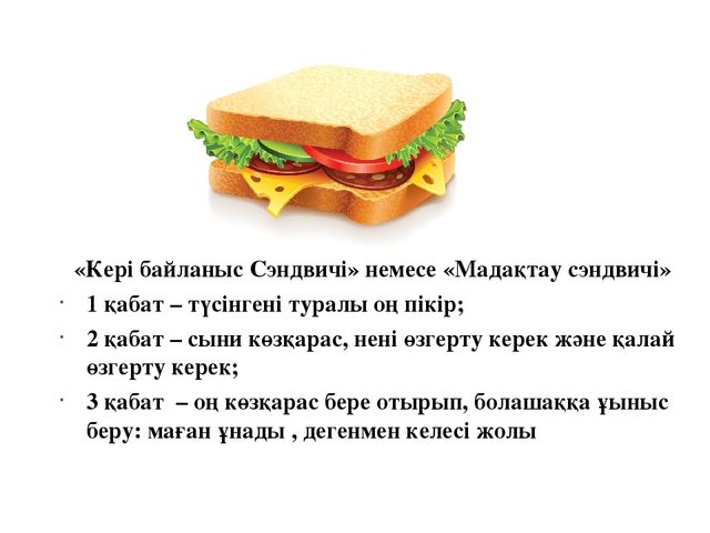 Сабақтың соңында мұғалім бағалау критерийлері мен сабақ мақсаттарына қайта оралады. Бағалау критерийлеріне қаншалықты қол жеткізгендері туралы бірге талқылайды. Рефлексия. Мұғалім оқушыларға рефлексия парағын үлестіреді. «Сэндвич» тәсілі арқылы оқушылар рефлексия береді.