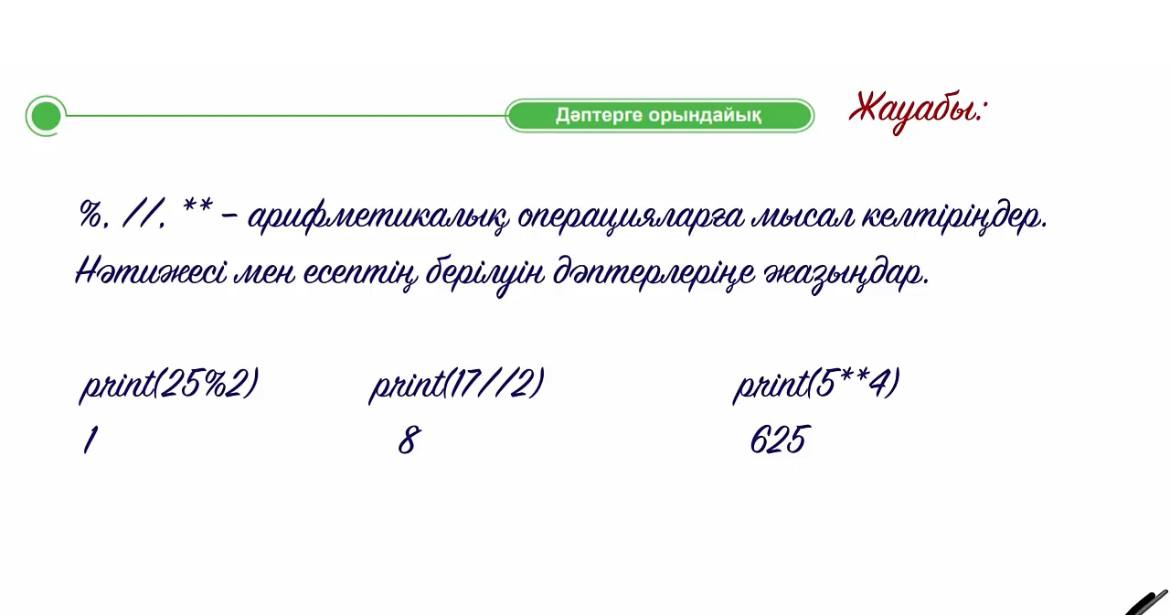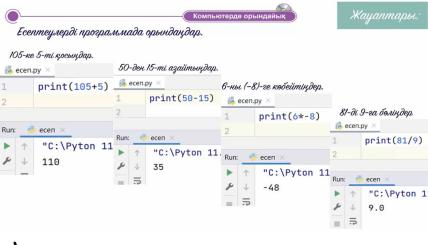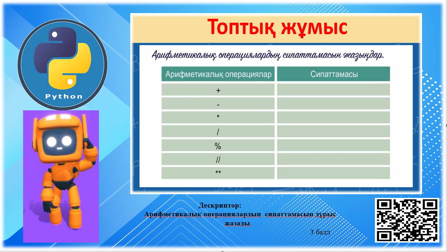 ҚБ Дескриптор: - Python тілінде есептің нәтижесі мен берілуін жазады 2балл Дескриптор: Python программасын қосады 1 балл - Python тілінде программа кодын жазады 1 балл Есептер нәтижесін шығарады 2 балл Дескриптор: -өрнектерді дұрыс сәйкестендіреді 4баллдан |