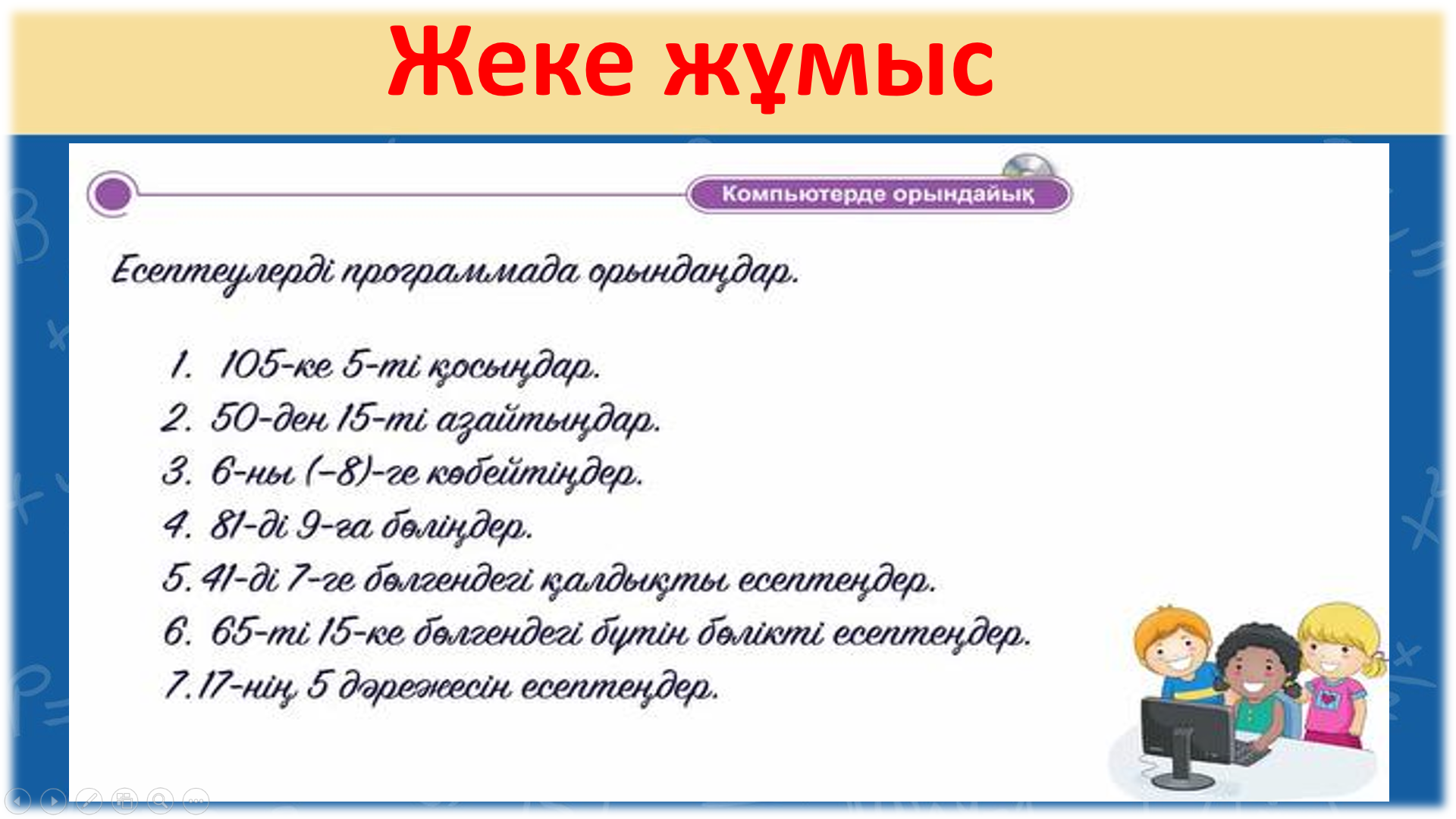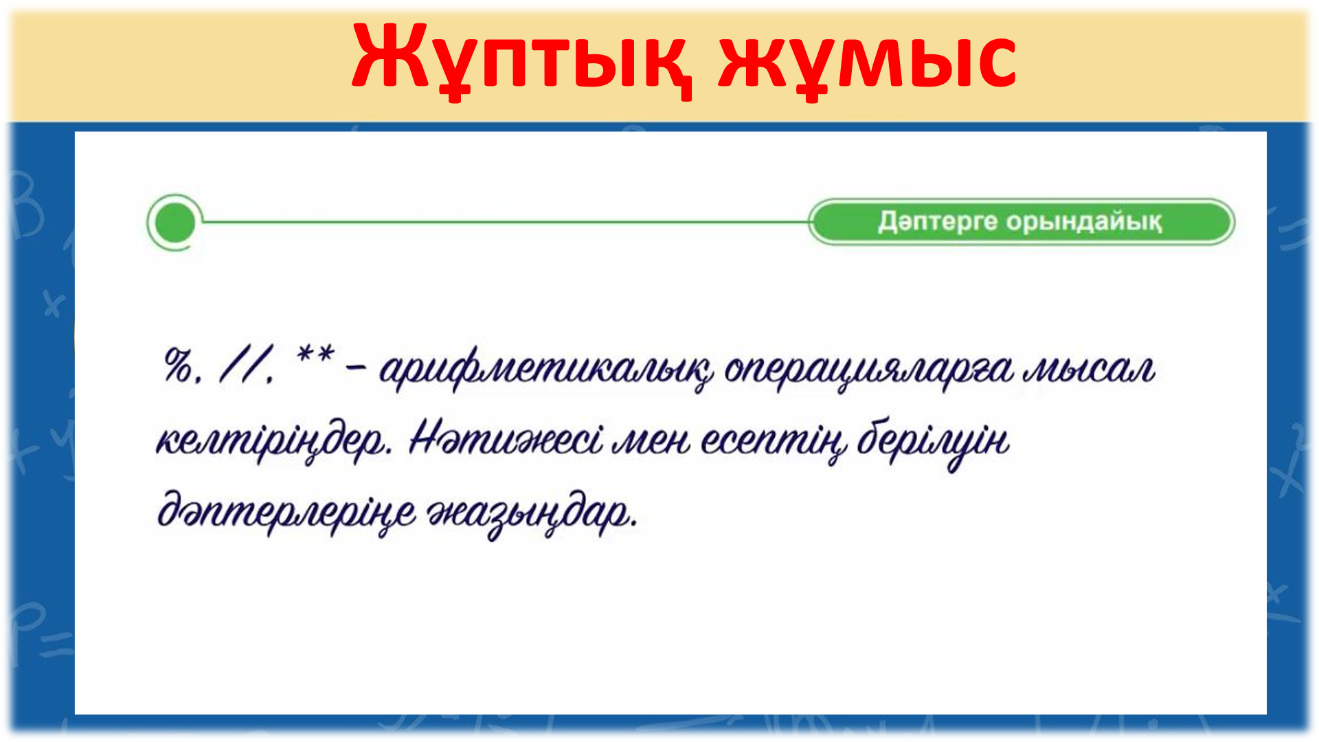 Топ болып тапсырманы орындайды Кестені толтырады Оқушылар жұптасып тапсырманы орындайды Программада есептер шығарады Платформаға кіріп, өрнектерді сәйкестендіреді |