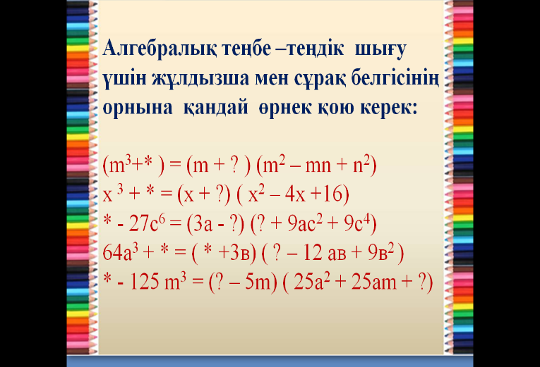 Дескриптор: -Қысқаша көбейту формулаларын қолдана алады -Есептеулерде қысқаша көбейту формалаларын қолдана алады -Дәлелдеуді жүргізе алады. ҚБ:«Бас бармақ» әдісі |
