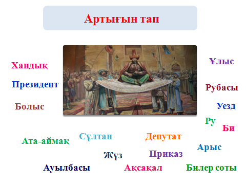 Ұйымдастыру кезеңі: Сәлемдесу ,оқушыларды түгелдеу Қазақ хандығының әкімшілік құрылымының алғашқы 3 сатысы: ауыл, ата-аймақ, ру бөліктері бойынша топтастыру Үй тапсырмасын пысықтау Learning apps қосымшасы арқылы үй тапсырмасын сұрау Оқылым алды «Артығын тап» тапсырмасы бойынша келесі ұғымдар беріледі