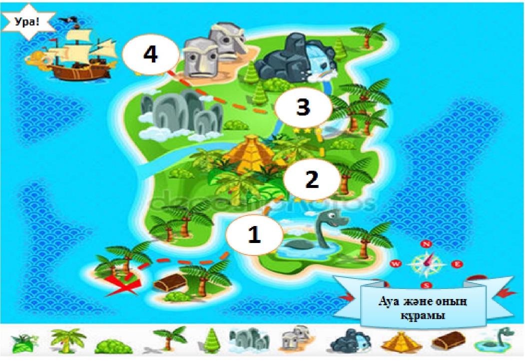 Қызығушылықты ояту. «Көрінбейтін сиқыршы» Жер бетінде көзге көрінбейтін сиқыршы бар. Онымен әркім-ақ күнделікті кездесіп отырады. Сен оны көрмейсің, бірақ маңайында екенін сезесің. Көшемен келе жатқанда топырақтың жұлынып түсіп, жорғала жүргенін көресің. Оны көрінбейтін сиқыршының алып бара жатқанын сезесің. Тіпті басын шұлғып, ырғалған шөптерді байқайсың. Сені үнемі қоршап тұрады. Сенімен бірге жүреді. Бар ма жоқ па оны анық білмейсің. Ол жоқ жерде өмір сүріп жүрмейсің. (Ауа) Саяхат сабағы: оқушылар « Ауа және оның құрамы» атты ЕЛСІЗ АРАЛДА тап болады. Сол аралдан шығу үшін бірнеше кедергілерден өту керек болады. Аралдан шыққан соң кетуге арналған кеме тек 8 оқушыны ғана көтереді. Қай топ кедергілерді жеңіп кемеге бірінші жетеді, сол топ Елсіз аралдан өз үйлеріне кетеді.