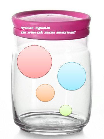 2-кедергі: «Құпия сурет» әдісі. Алдымен мәтінмен жұмыс жүргізіледі. Суретте бейнеленген бөлікті мәтіндегі мәліметтер бойынша толтырады. Бағалау критерийі: 20 ұпай -Ауаның құрамын кім анықтағанын табады. -Ауаның құрамындағы газдарды көлемдік үлесі бойынша сәйкес шарларға орналастырады.