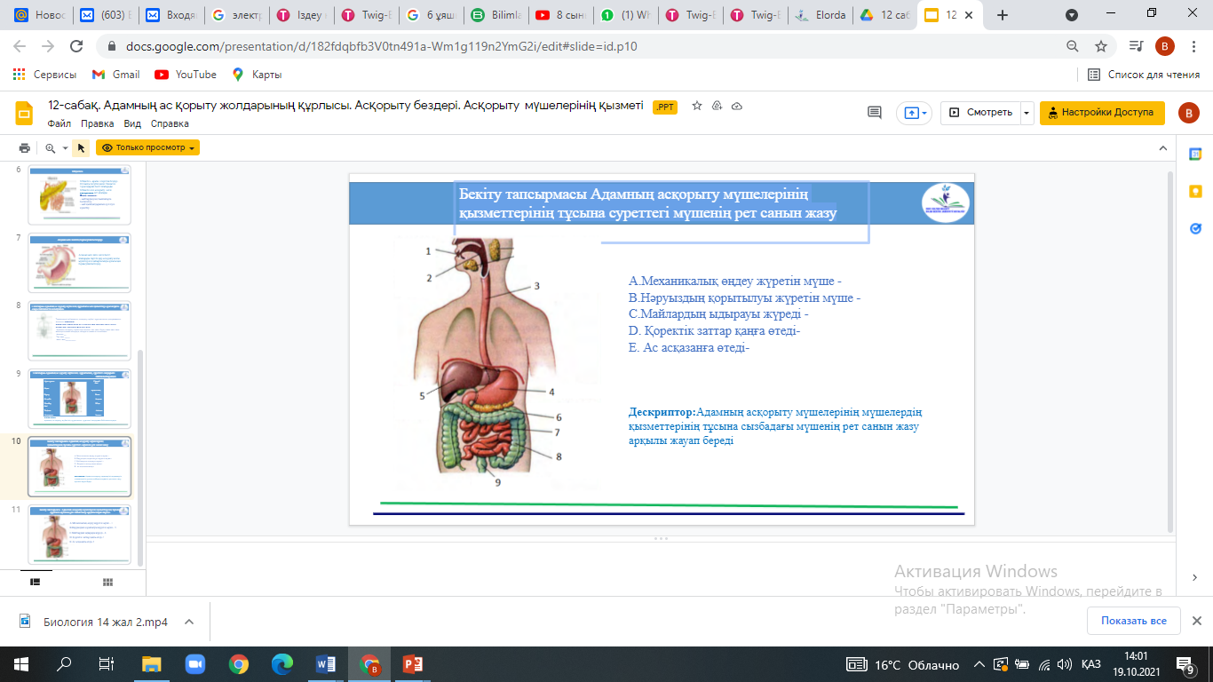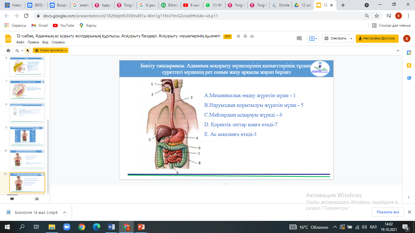 -Тіс қаптамасы, мойны мен түбірінің қызметін сипаттай алады; -Тіс типтері (құрылысы бойынша) мен олардың рөлі арасындағы байланысты анықтай алады;. -Кіреуке, дентин мен жұмсақ ұлпасының (пульпа) рөлін біледі; -Асқорытуға қатысатын мүшелерді атайды; -Асқорыту механизмін түсіндіреді; -асқорытуға қатысатын бездердің қызметін сипаттай алады. |