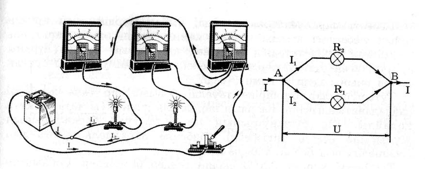 2-жағдай. Егер өткізгіштердің басын бір ғана А нүктесінде, ал ұштарын екінші бір В нүктесінде жалғасақ, онда мұндай жалғауды өткізгіштердің параллель жалғау деп атайды.