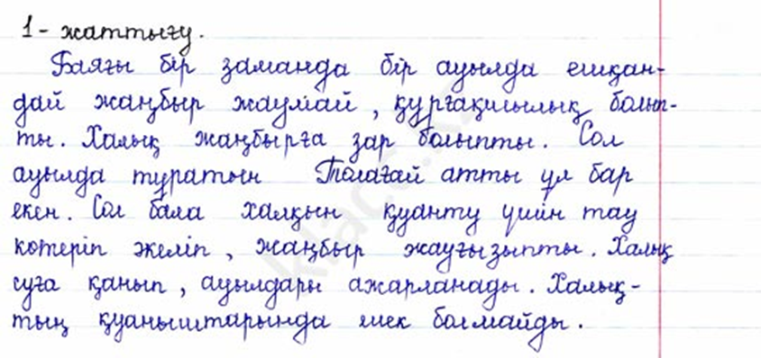 Психологиялық дайындық "Австралиялық жаңбыр" Австралияда жел тұрды (алақанды үйкеле) -Жаңбыр тамшылай бастады. (саусақты соғу) -Жаңбыр күшейе түсті(алақанды кеудеге соғу) -Нөсер қатты соқты (алақанды санға соғу! -Міне бұршақ жауды (аяқпен тарсылдату) -Дауыл басыла бастады (алақанды санға соғу) -Жаңбыр сейілді (алақанды кеудеге соғу) -Жаңбыр сіркіреді (сасақты соғу) Жел басыла бастады (алақанды үйкелеу) -Алақай күн шықты (қолды жоғары көтеру) Топқа бөлу : Толағай ,Жасұлан ,Қобыланды Топ ережесімен таныстыру 1.Бірлесіп жұмыс жасау 2.Бір-біріміздің пікірін тыңдау. 3.Уақытпен санасу 4.Белсенді қатысу 5.Тыныштық сақтау 6.Кезекпен сөйлесу Үй тапсырмасы Тамшылар арқылы үй тапсырмасын сұрау - «Не жауып тұр?» өлеңінің авторы кім? -Отбасы мүшелері жаңбырдан қандай жақсылық күтеді? - «Жаңбырға екі өтініш» өлеңінде балалар жаңбырға қандай өтініш айтады? -Екі өлеңде қандай ұқсастық бар? -Жаңбырдың қандай түрлерін білесіңдер? Ой қозғау сұрақтары -Балалар жаңа қалай топқа бөліндік? -Неге олай бөліндік деп ойлайсыңдар? (балалар өз жауап тарын айтады) -Қандай тақырып өтуіміз мүмкін? Сабақтың мақсатын хабарлау -Өте дұрыс жауап бердіңдер Бүгін біз сіздермен жаңа тақырыппен танысамыз. Әбділда Тәжібаев ағамыздың " Толағай" аңызымен танысамыз. Ол аңыздың мазмұнын білмесі бұрын сіздер оқулығымызда берілген суретке қарап , сол сурет бойынша әр топ ,топта қысқаша әңгіме құрып оқып берейік. Жаңа тақырып ФС тапсырмасы «Құрастыр» айдары бойынша оқулықтағы суретті сипаттау.