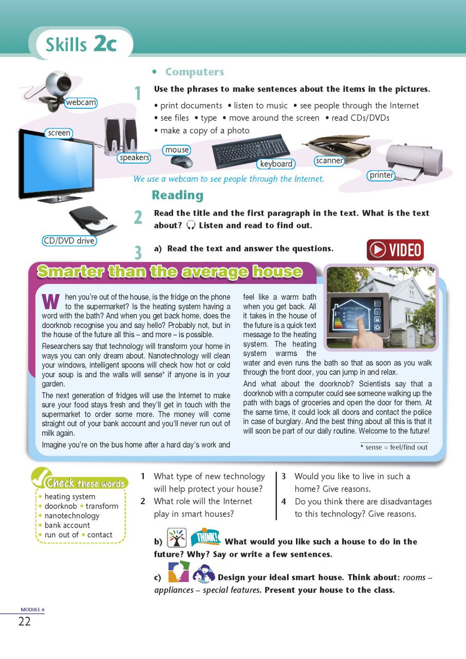 Post reading tasks. Look at the texts again and answer the questions in written form, and then present your work. 1 What type of new technology will help protect your house? 2 What role will the internet play in smart houses? 3 Would you like to live in such a home? 4 Do you think there are disadvantages to this technology? Give reasons. Energizer Writing Write new words from the text