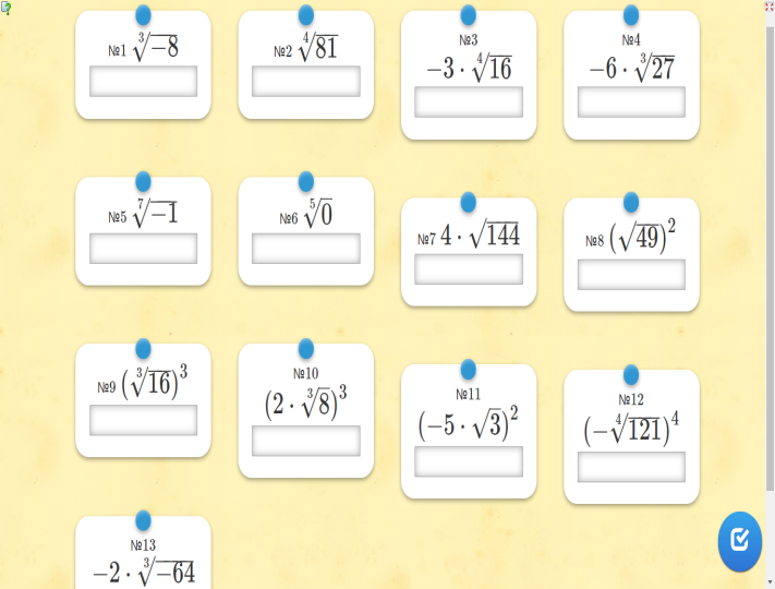 -Үй тапсырмасын «Көршіңді тексер» әдісі бойынша тексереді. Үш топқа бөлінеді; І топ: «Дәреже»; ІІ топ: «Түбір»; ІІІ топ : «Формула» Өтілген тақырып бойынша формулаларды еске түсіріп, қолданады