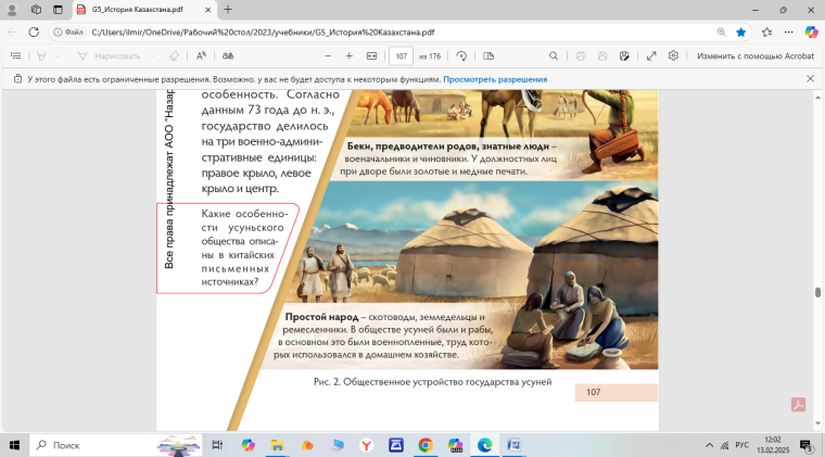 Деректерді пайдалана отырып,ежелгі Қазақстан аумағын мекендеген үйсін мемлекеттік бірлестігінің құрылуын сипаттау. Үйсін мемлекетіндегі әлеуметтік топтардың ерекшеліктерін аша отырып, оларға анықтама беру. |
