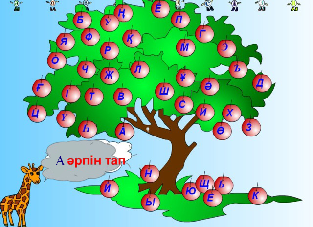 Ойынның шарты: алма ағаштың алмасына жазылған әріптердің ішінен А әрпін тауып қоршап сызу.