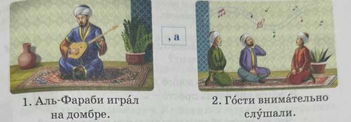 * Сколько раз играл аль-Фараби на домбре? Что происходило в это время с людьми? Индивидуальная работа. Составьте вопросы к тексту. Задайте их одноклассникам. Кто ... ? Что ...? Почему? Физкультминутка. Упражнение №4 Рассмотри картинки. Прочитай 1-е предложение, потом - 2-е предложение. Какой союз соединил два предложения?