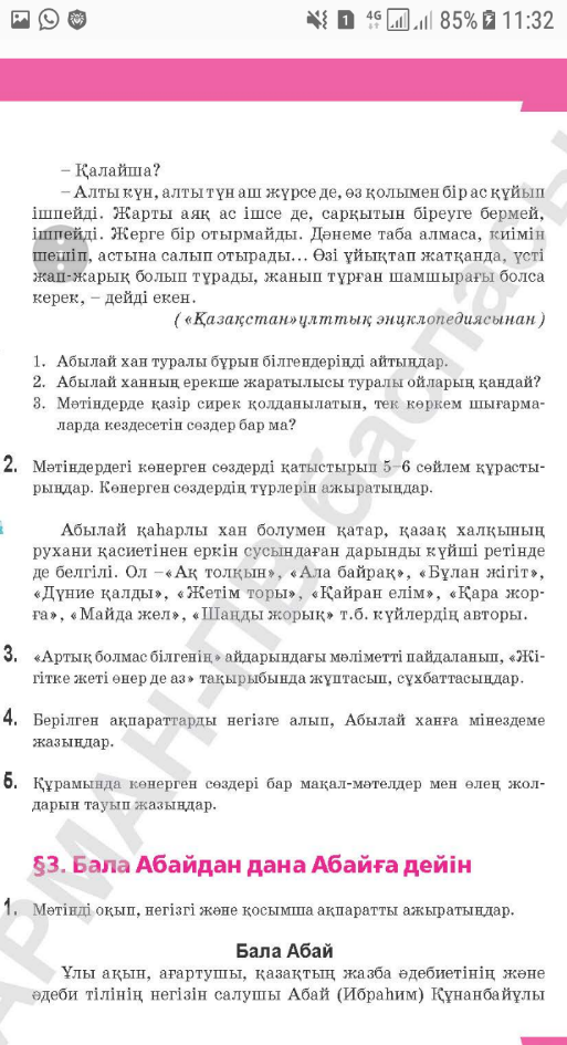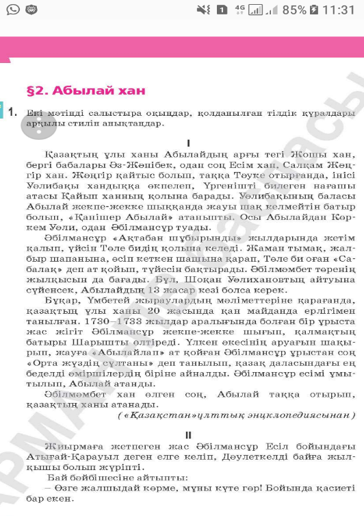 Оқушылар орындай алады: Мұғалім жетекшілігімен мәтін мазмұнымен таныса отырып, негізгі және қосымша ақпаратты, көтерілген мәселені анықтау үшін сұрақтар құрастырады, көнерген сөздердің қолданыс аясын түсінеді және түрлерін ажыратады. Пәнге қатысты сөздік қор мен терминдер: Хан, тақ, жекпе-жек, хандық, жырау, жалшы. Архаизм, историзм сөздер Диалог құру, шығарма жазуға арналған пайдалы тіркестер: Ұлы хан, арғы тек, «Ақтабан шұбырынды» жылдары, «Орта жүздің сұлтаны», жекпе-жекке шығып, қазақ даласы, жыраулар дерегі Талқылауға арналған сұрақтар: Абылай хан тарихи тұлға ретінде ұлт көшбасшысы болуға лайық деп ойлайсыңдар ма? |