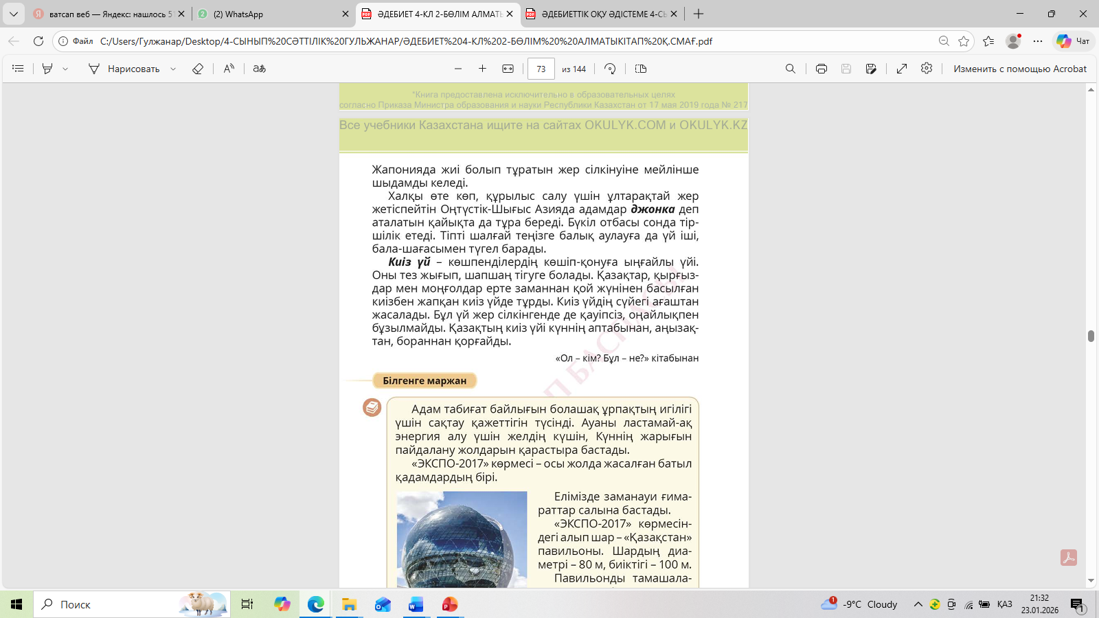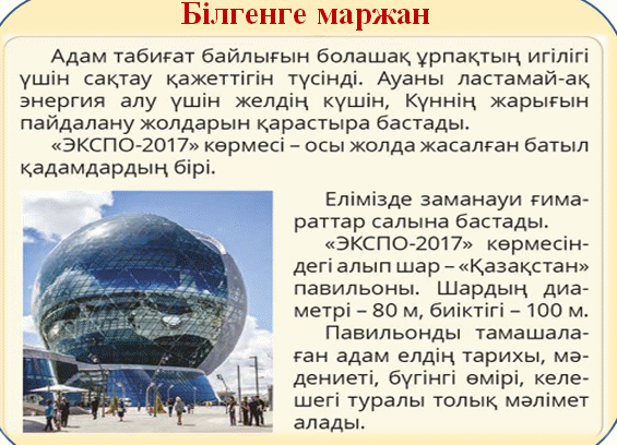 Көңіл-күйлері көтеріліп, бір-біріне жақсы тілектер айтады Алдыңғы білімді еске түсіреді Филвордта жасырынған сөзді табады 1-тапсырманы орындау арқылы бүгінгі сабақтың тақырыбы болжанады мәтінді әр оқушы жеке теріп оқиды және мәтіндегі мәліметтерді кестеге толтырады Сұрақтарға жауап береді, жауаптарын тұжырымдайды және өздерінің көзқарастарын дәлелдейді ЭКСПО туралы мәлімет алады Мәтіннің жүйесін анықтайды,иллюстрациямен сәйкестендіреді Мәтіннің бөліктерге бөледі,тақырып қояды. Постер құрайды. Кестені толтырады Киіз үйді қазіргі заманауи үйлермен салыстырады Баспаналар әр маусымда қандай болатынын баспаналардың жайлылығы турады айтады Әр топ мүшелері алдарына берілген тапсырмалар бойынша жұмыстарын дайындайды, ортаға салады. Бір-бірімен ақылдасады, ортақ түйін шығарады.