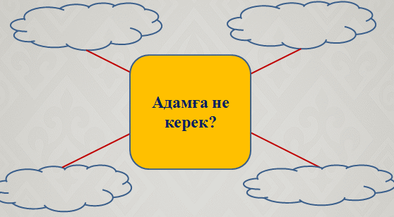І.Ұйымдастыру кезеңі «Жылы лебіз» әдісі «Сенің үйің ,сенің қорғаның...»деген ойды жалғастырып айтып лебіздерін білдіреді. Топқа бөлінеді Өткенге шолу: “Сұрақ менен, жауап сізден” әдісі Мәтін не туралы? Планетарий дегеніміз не? Планетарий арқылы біз нені көре аламыз? Планетарий аталуының себебі неде? Жазып келген ертегілерін оқыту ІІ. Қызығушылықты ояту. «Бір айналым сөйлесу» әдісі арқылы сұрау. Адамның өміріне не керек екенін айтыңдар.
