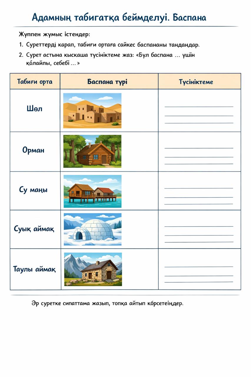 Дескриптор: -Баспаналардың маусымға байланысты өзгешеліктерін айтады-1б Жайлылығы туралы айта алады-1б Дескриптор: Киіз үйді қазіргі заманауи үйлермен салыстырады -1б Қызық баспана туралы айтады-1б ҚБ: Жарайсың!