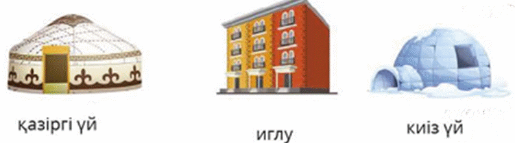болатынын айтыңдар. Мәтіндегі баспаналардың жайлылығы туралы не айтуға болады? 3-жұп Киіз үйді қазіргі заманауи үйлермен салыстыр? -Өздеріңе қызық болған баспана туралы әңгімелеңдер? 4-жұп Баспаналардың түрлері туралы видео жасаңыздар? ЕБҚ Сәйкестендір