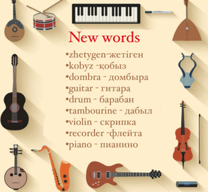 Pupils glue these cards with new words into the notebooks. The pupils listen to the melody and run to the pictures. Answer the question and repeat the words, chorally or individually. (-It’s a drum) Pupil’s answer Listen, repead and write the new words. Pupils listen to the teacher and complete the activity. Answer key : The zhetygen is a string instrument. The kobyz is a string instrument. The flute is a woodwind instrument. The piano is a keyboard instrument. The drum is a percussion instrument. |