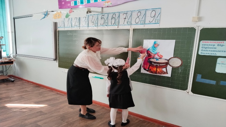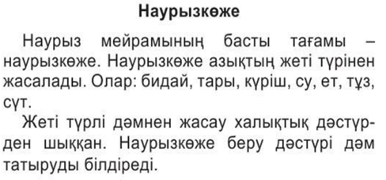 Оқушылар ЖИ арқылы «Наурыз көже »мәтінін интерактивті тақта арқылы бейнежазбада тамашалады .Мәтін мәнерлеп оқылды және оқушылар тізбектей отырып мәтінді оқып шықты.Барлық оқушылар қамтылды. «Әжейдің тапсырмасы » арқылы наурыз көже құрамын жапсырма арқылы орындады.