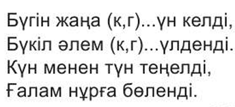 Оқушылар 3-жаттығуда тиісті әріпті қойып өлеңді көшіріп жазады: ...күн келді ...гүлденді